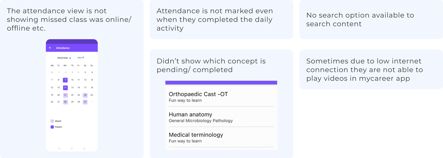 Virohan's MyCareer app creates confusion and frustration for students trying to track their attendance and complete daily activities. The outdated design doesn't align with Virohan's brand identity, lacks consistency across components, and delivers a poor overall user experience.